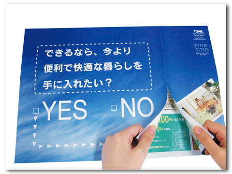 个人信息保护产品与提高消费者的信赖有着密切的相关。为适应时代的需求,我们在广告中用于回复的明信片上采用特殊加工,相继开发出具备个人信息保护功能的「不透字宣传单」、以及在背光下也无法窥视的「遮光不透字宣传单」,在注重个人信息保护的企业中得到广泛的应用。