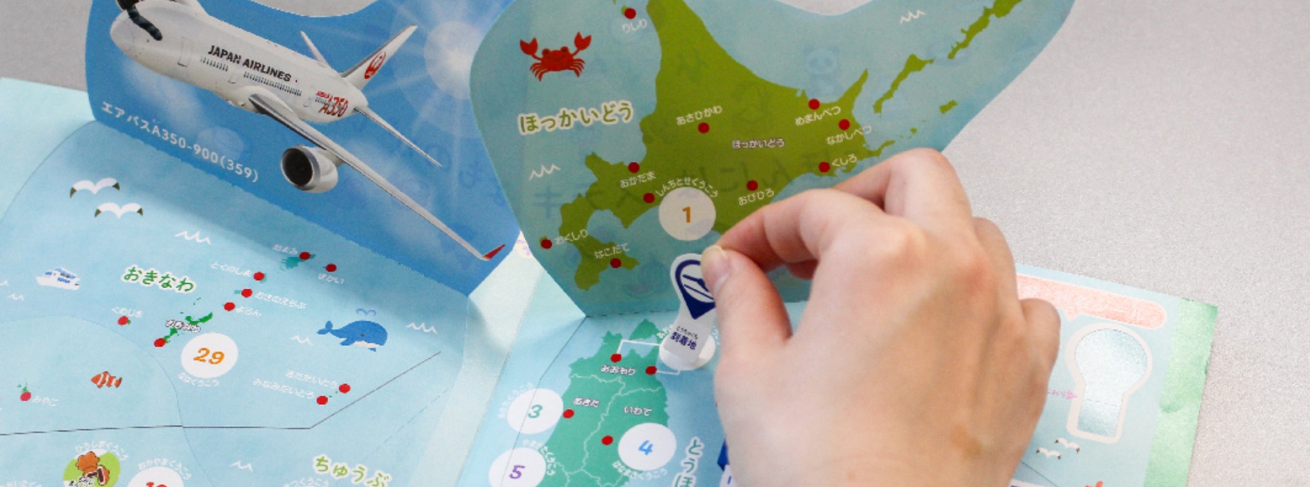 完成した製品は、2種類のシールブックとミニ図鑑をセットにしたオリジナル仕様の1冊。前半は小さなお子さま向けのシールを貼って遊べる可愛いシールブック、後半は小学生向けの都道府県名産シールブックと飛行機大きさ図鑑です。